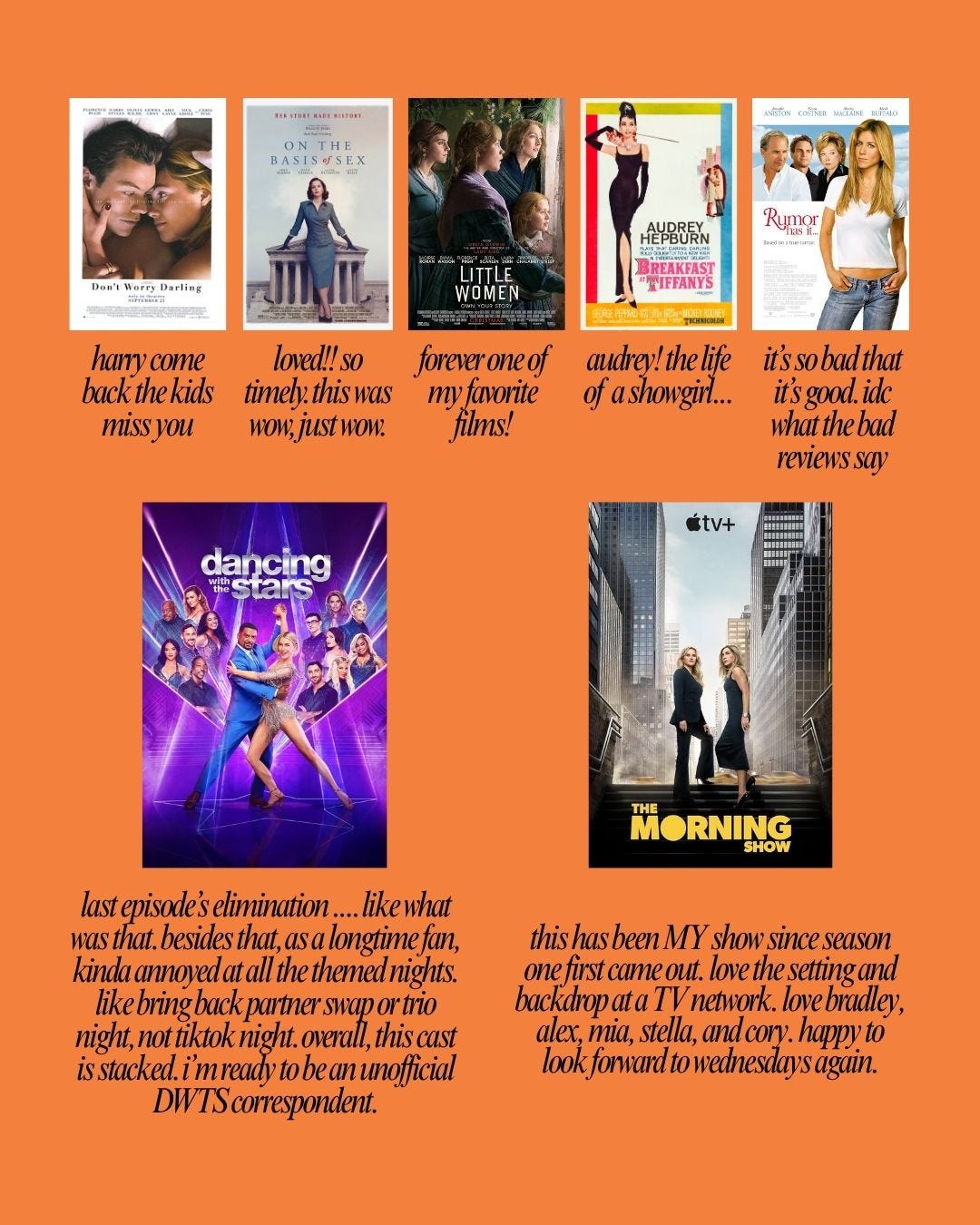 Don’t Worry Darling — Harry come back, the kids miss you. (But I hope you’re doing okay.) That aside, I think the drama surrounding the movie’s press tour sullied the actual message of the movie. I’m not that interested to write more thoughts on it, but something to consider.